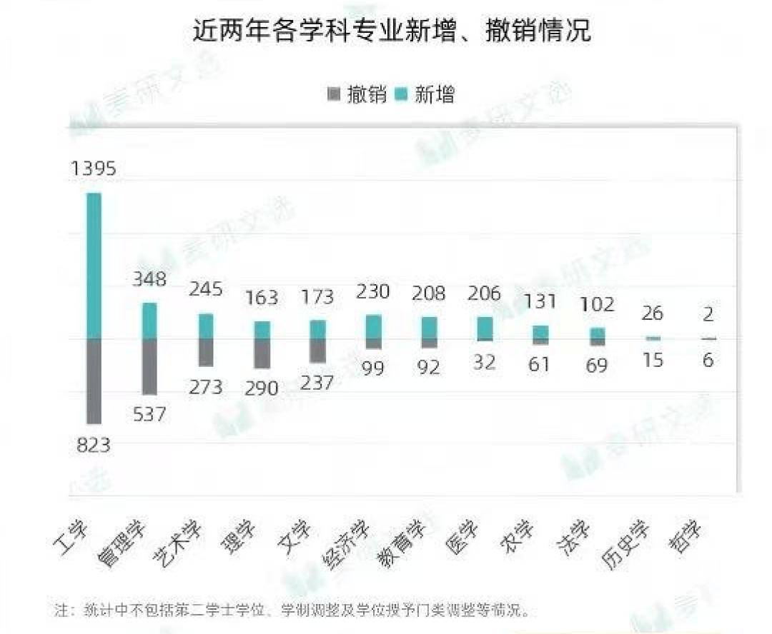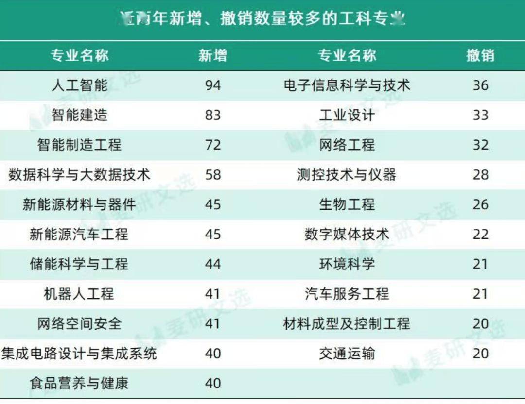 其中,工学专业调整力度最大,新增专业1395个,撤销专业达823个。工学新增专业以计算机类、电子信息类、机械类专业为主。比如名称中带“智能”的人工智能(94个)、智能建造(83个)、智能制造工程(72个)专业被大批高校新增设置;其他增设较多的专业主要涉及国家战略发展方向的新能源、大数据、机器人等领域。工科新增专业多,撤销数量也多,并且同样以机械类、电子信息类专业为主。从具体专业看,部分传统工学专业,如电子信息科学与技术(36个)、工业设计(33个)、网络工程(32个)被撤销数量相对较多。